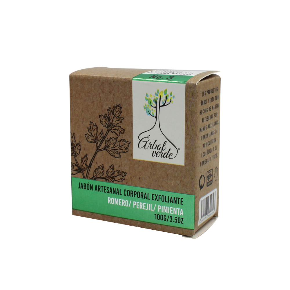 Jabón Artesanal Corporal en barra cuyos activos naturales, romero, perejil y pimienta, exfolian profundamente la piel. Es un producto natural y vegano, libre de crueldad animal, que nutre y da vida a tu piel de forma natural.