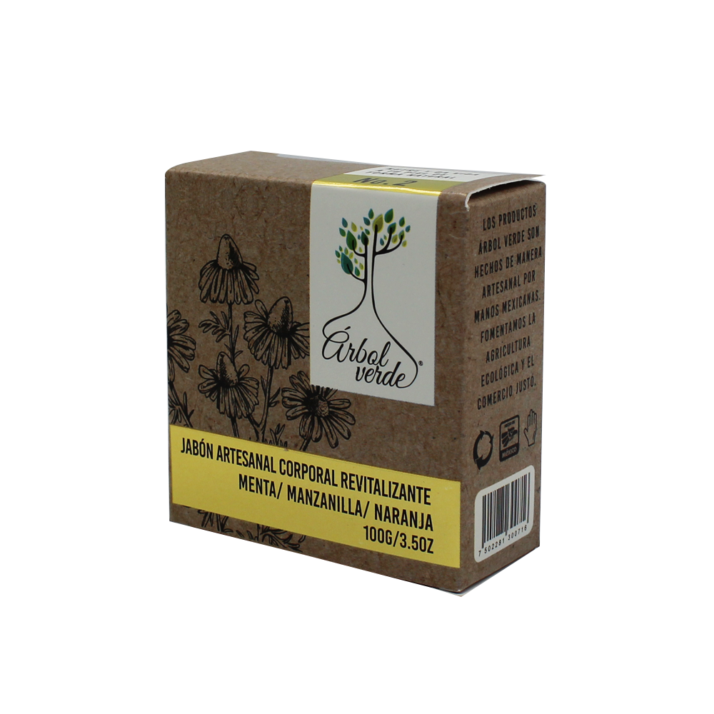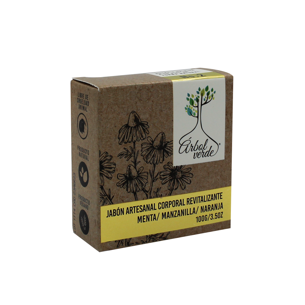 Jabón Artesanal Corporal en barra cuyos activos naturales, menta, manzanilla y naranja, revitalizan profundamente la piel. Es un producto natural y vegano, libre de crueldad animal, que nutre y da vida a tu piel de forma natural.